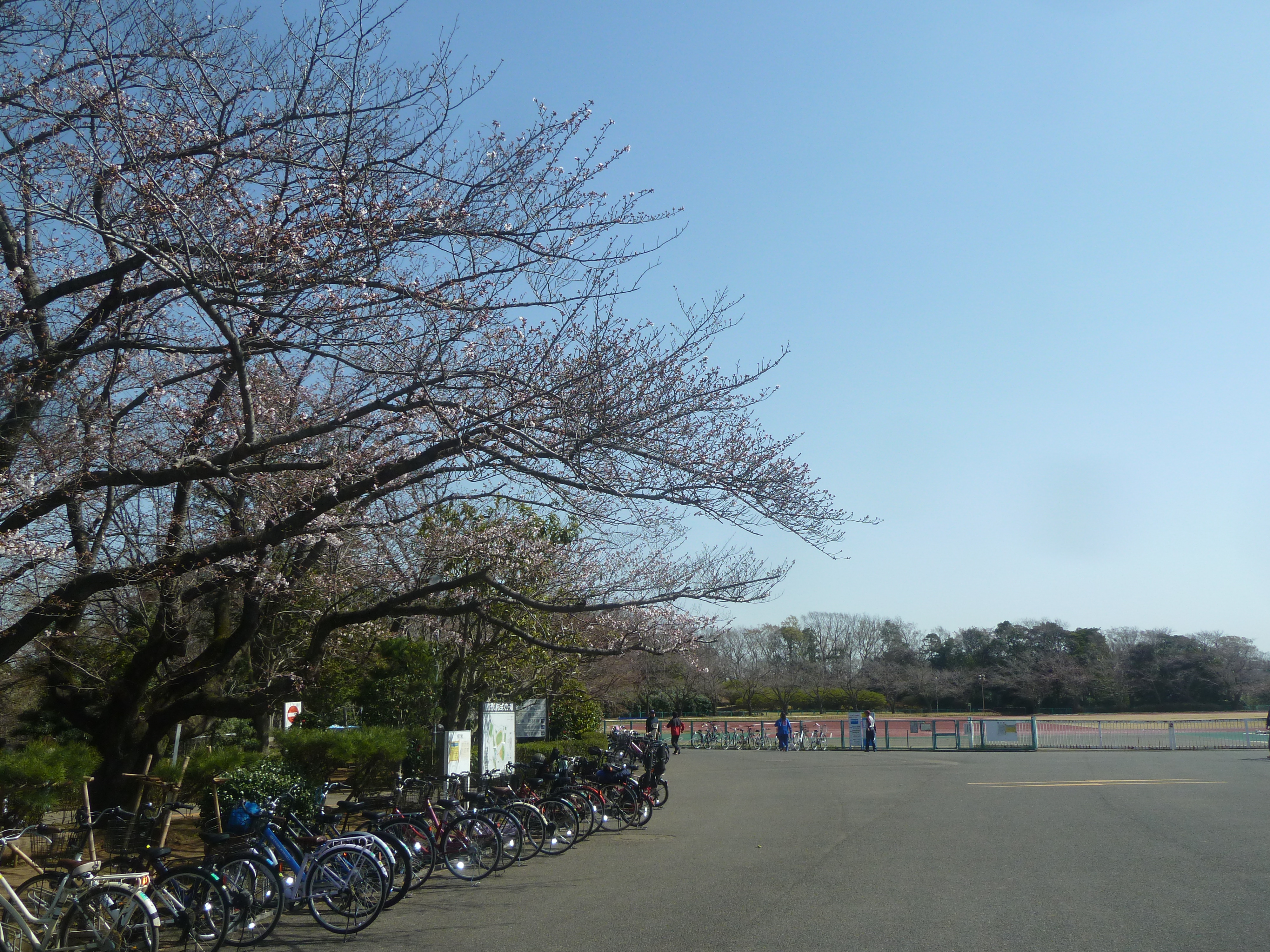 春休みで若い人が集まる運動公園、桜の開花が進んでいます。