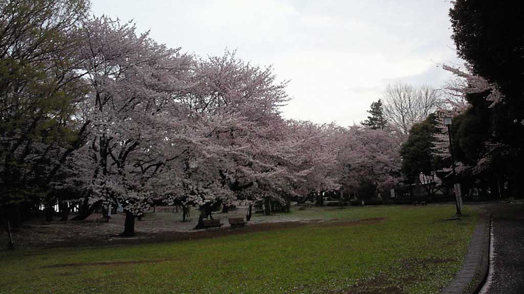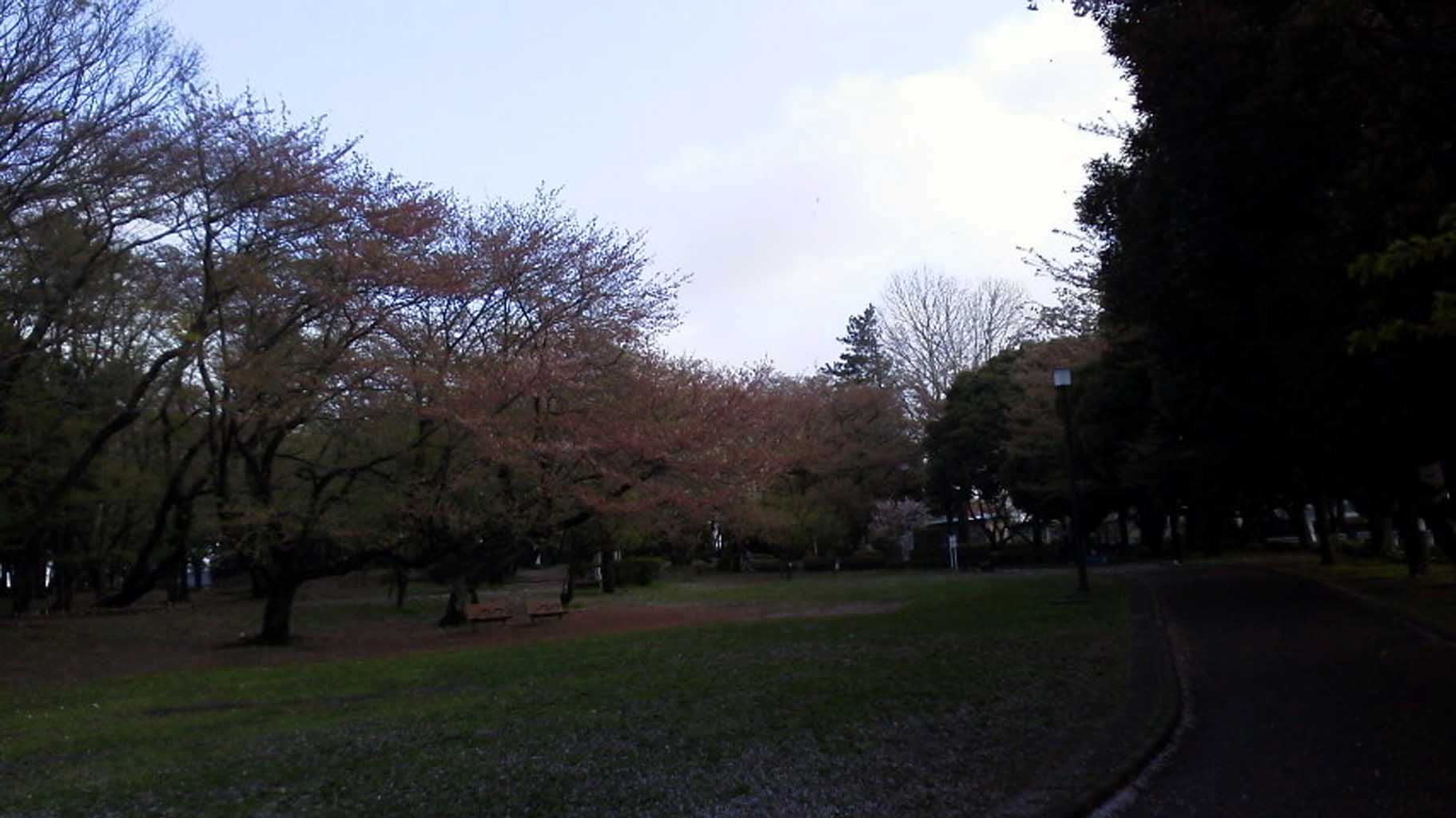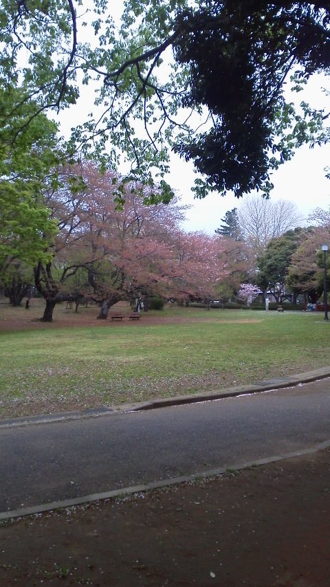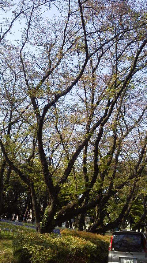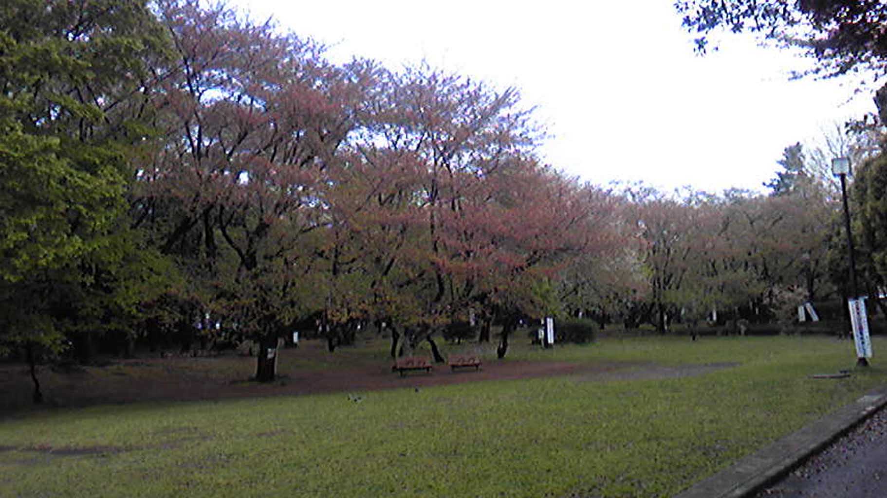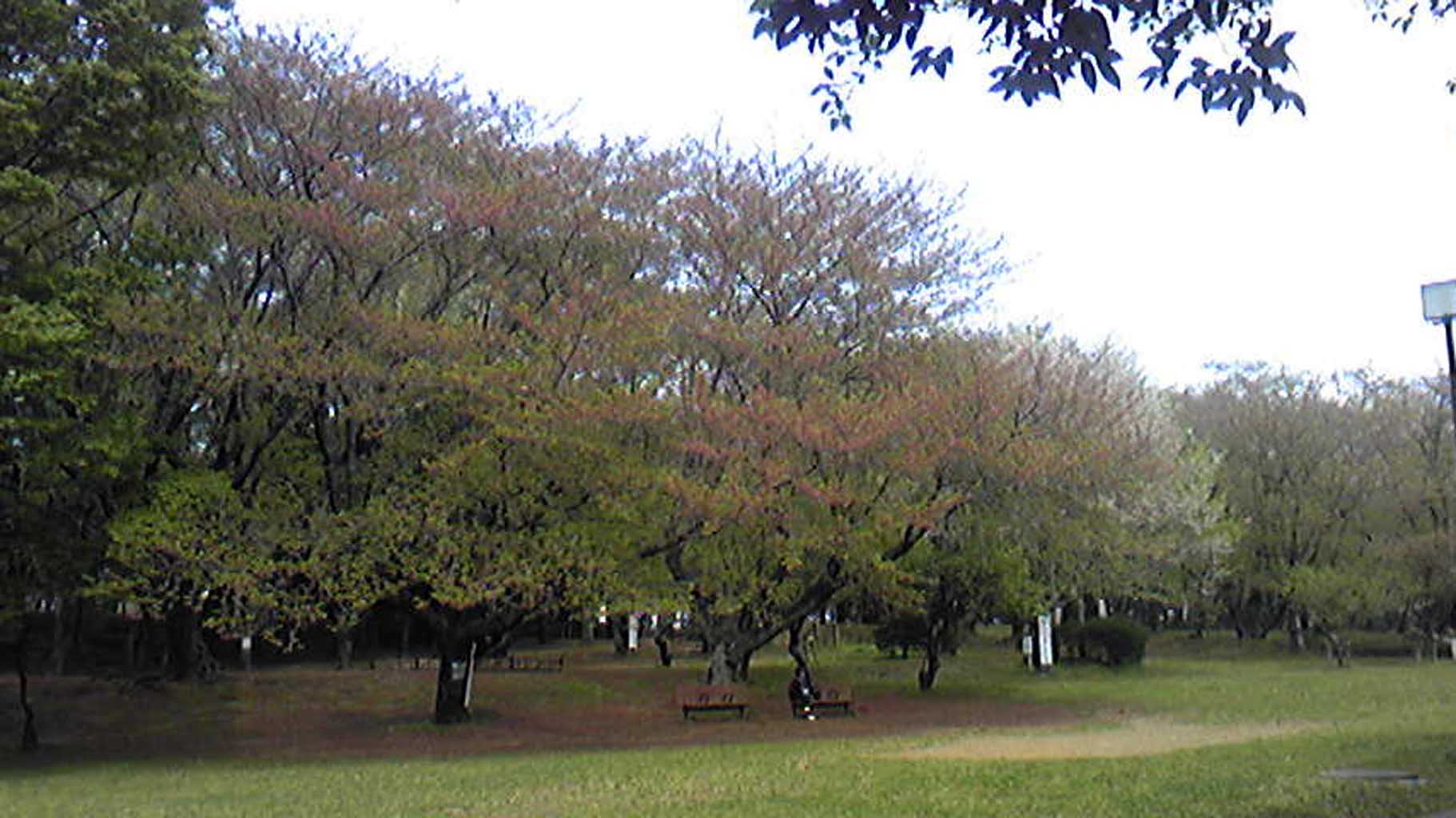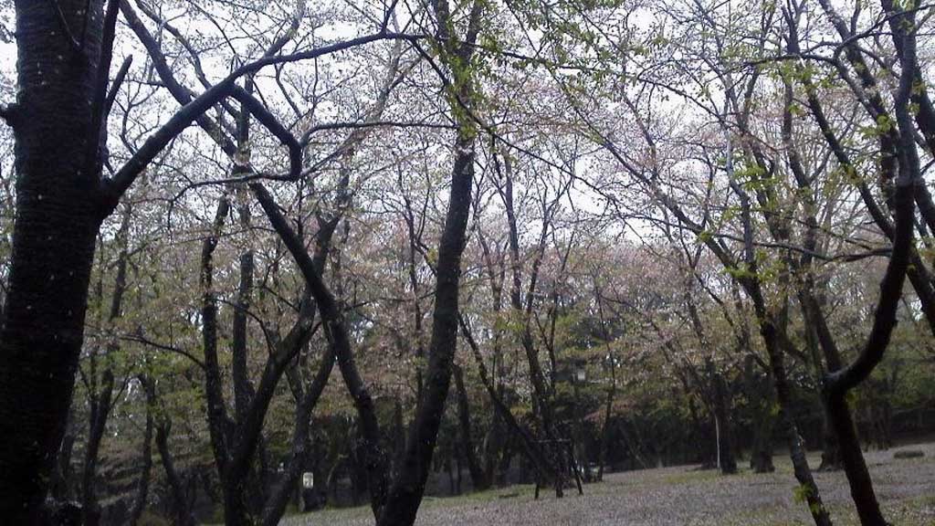 広い公園の中には、まだ花が咲いている桜の木もあります。