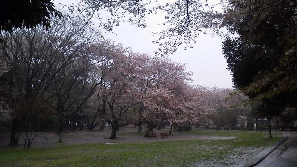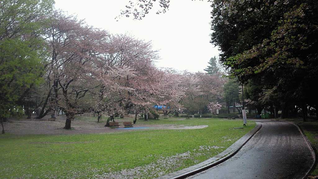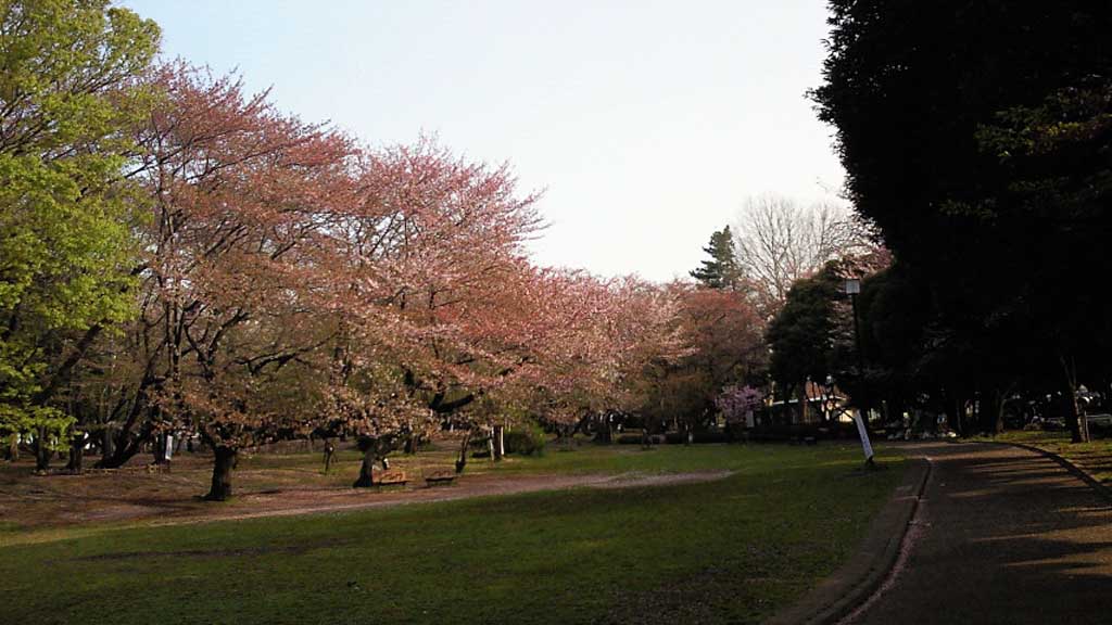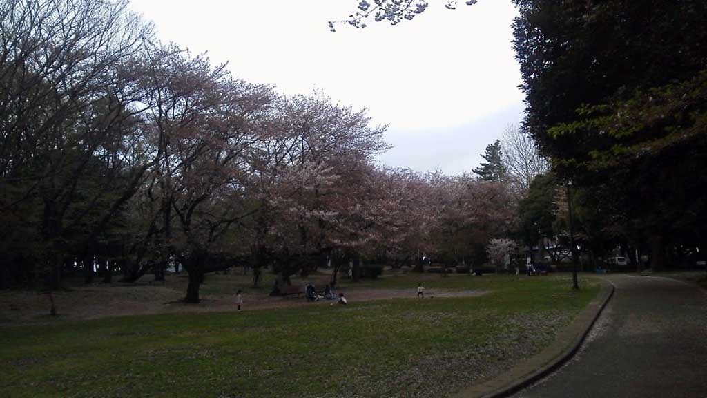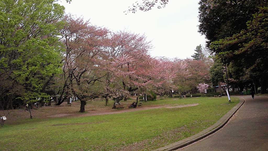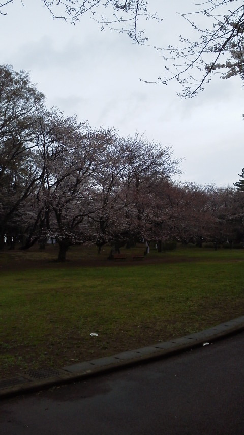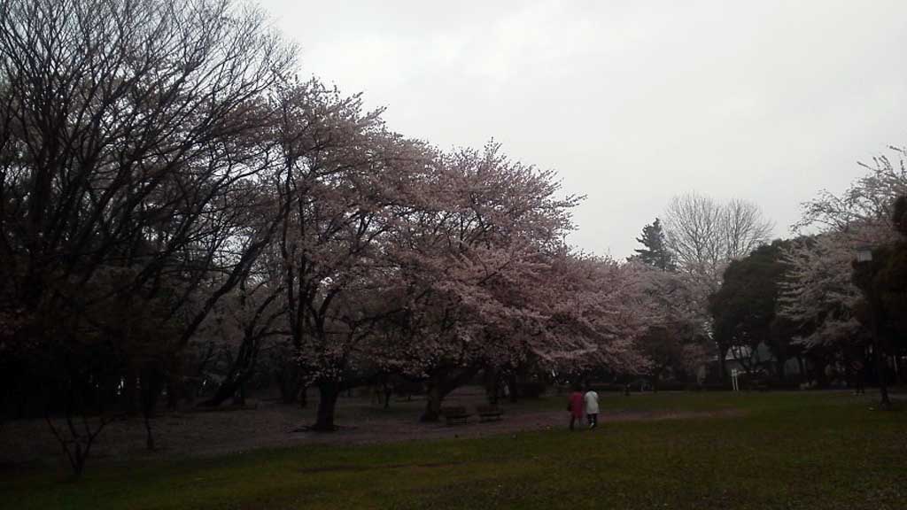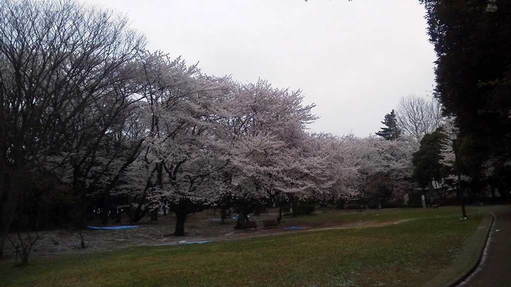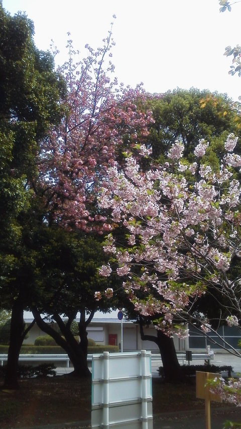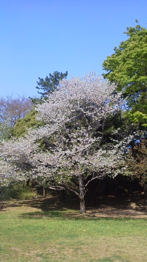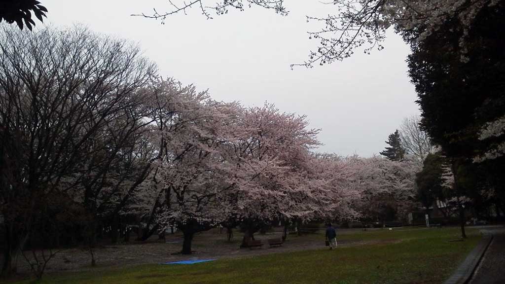 広い公園の中には、まだ花が咲いている桜の木もあります。
