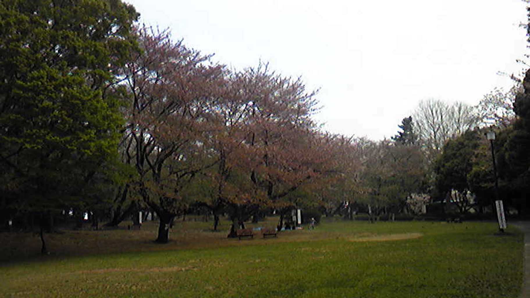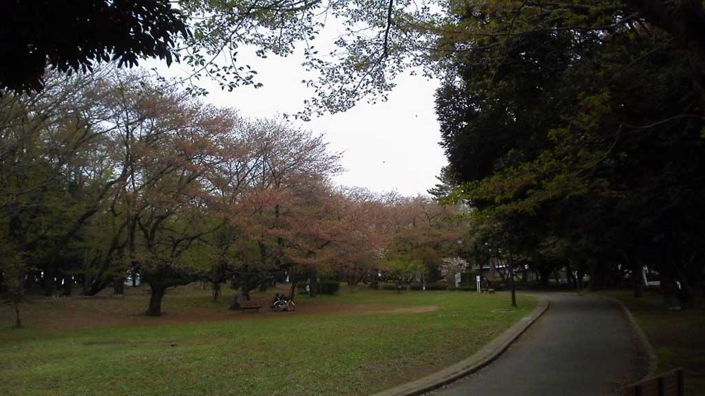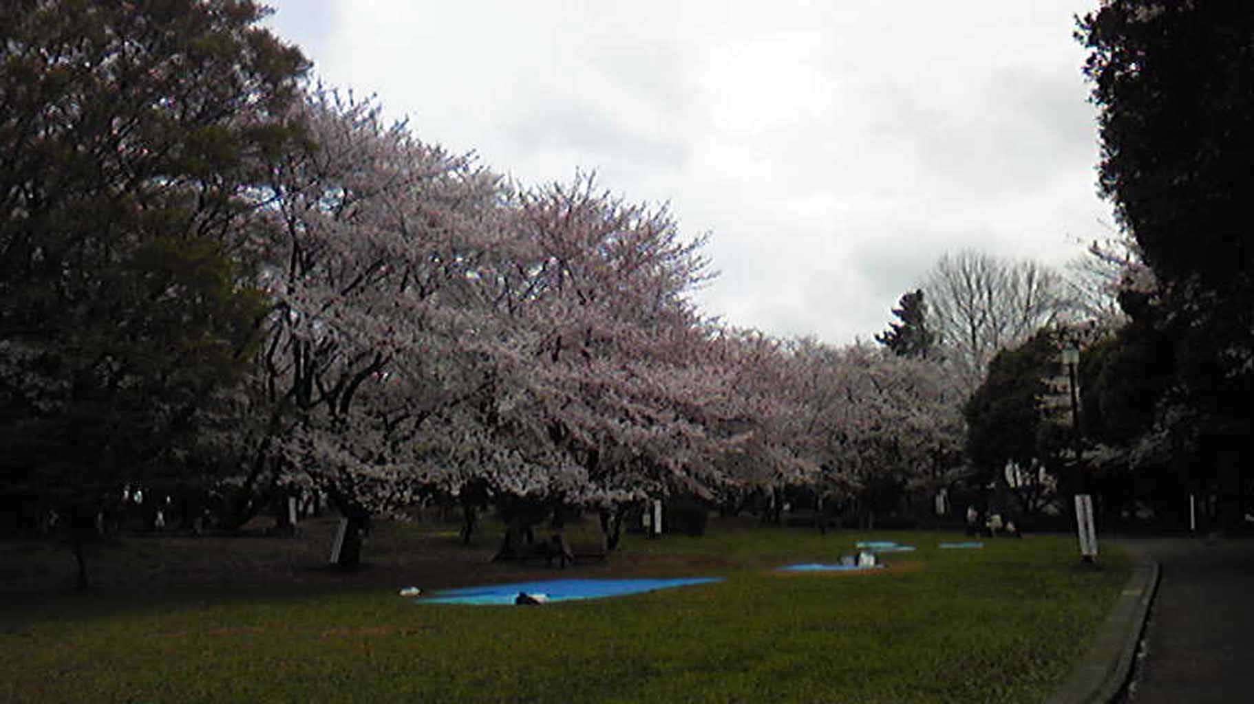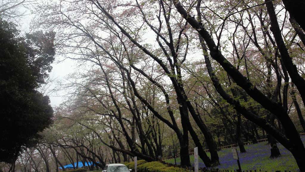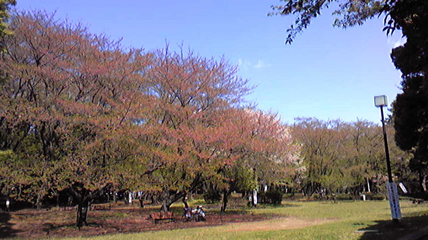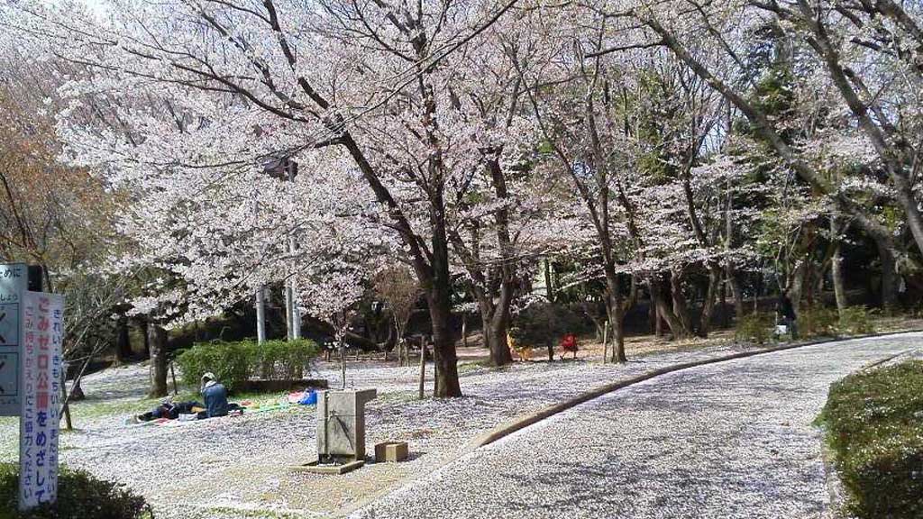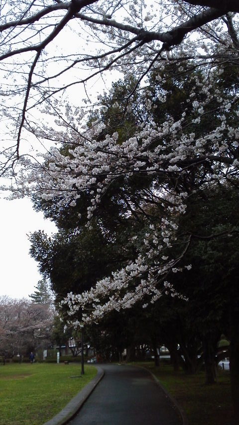 広い公園の中には、まだ花が咲いている桜の木もあります。