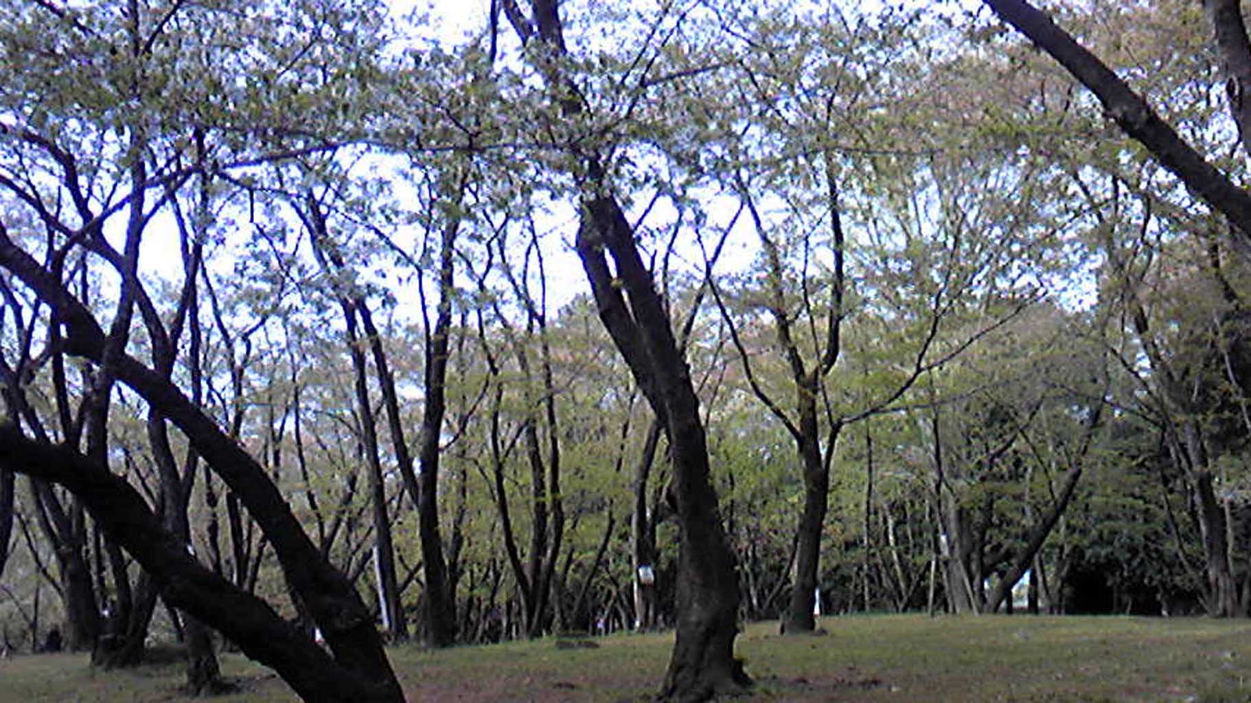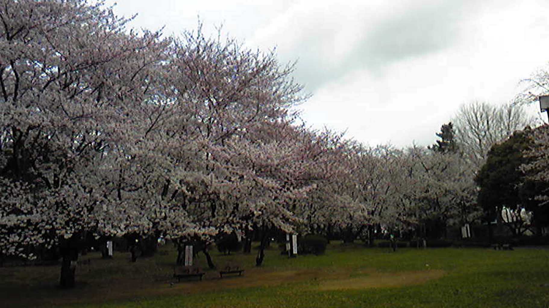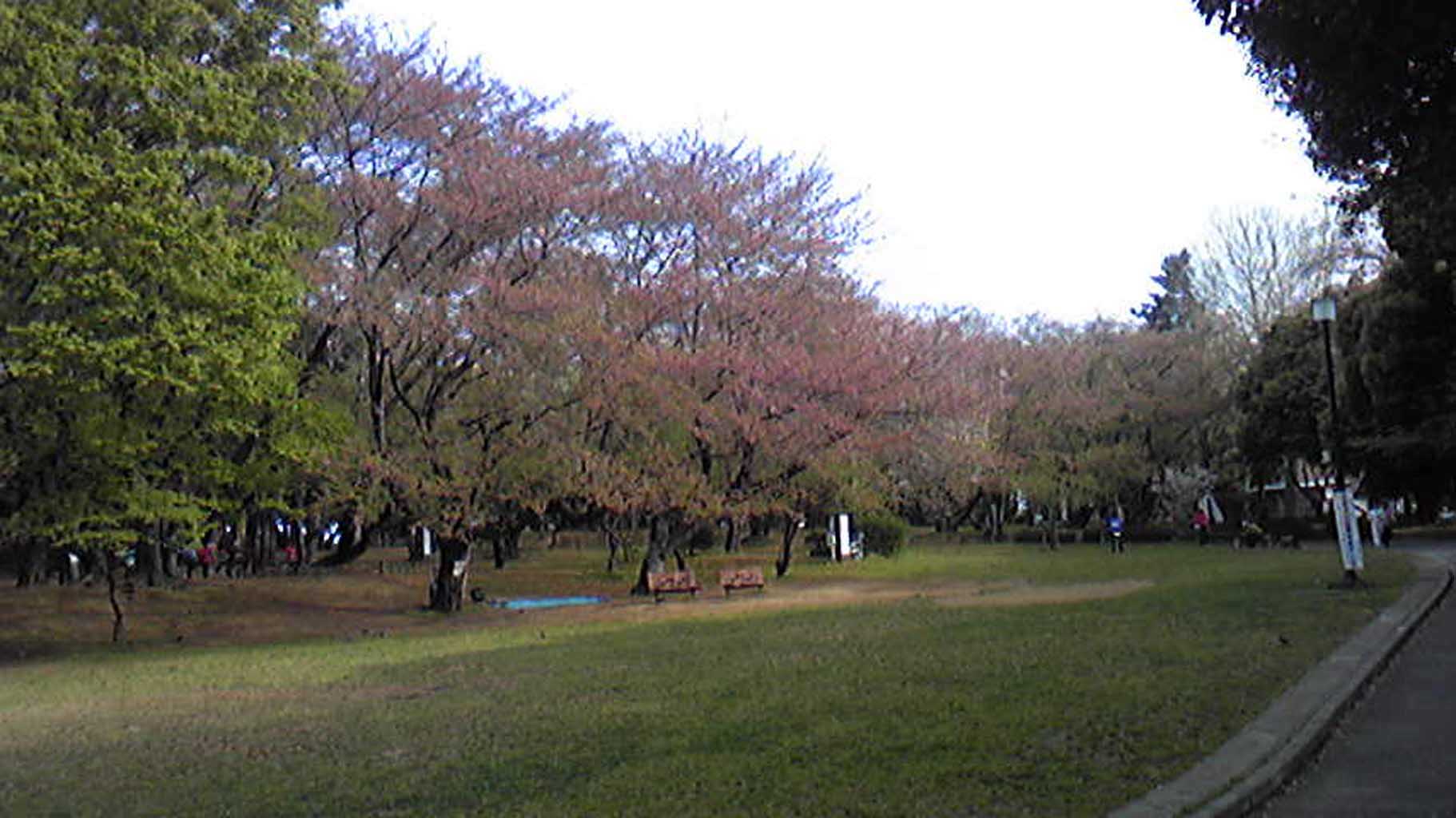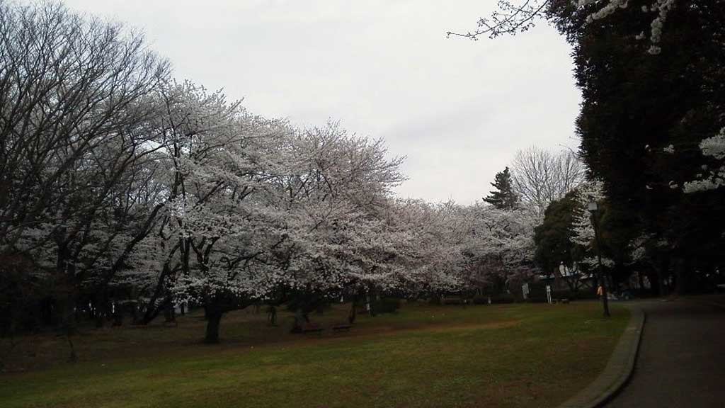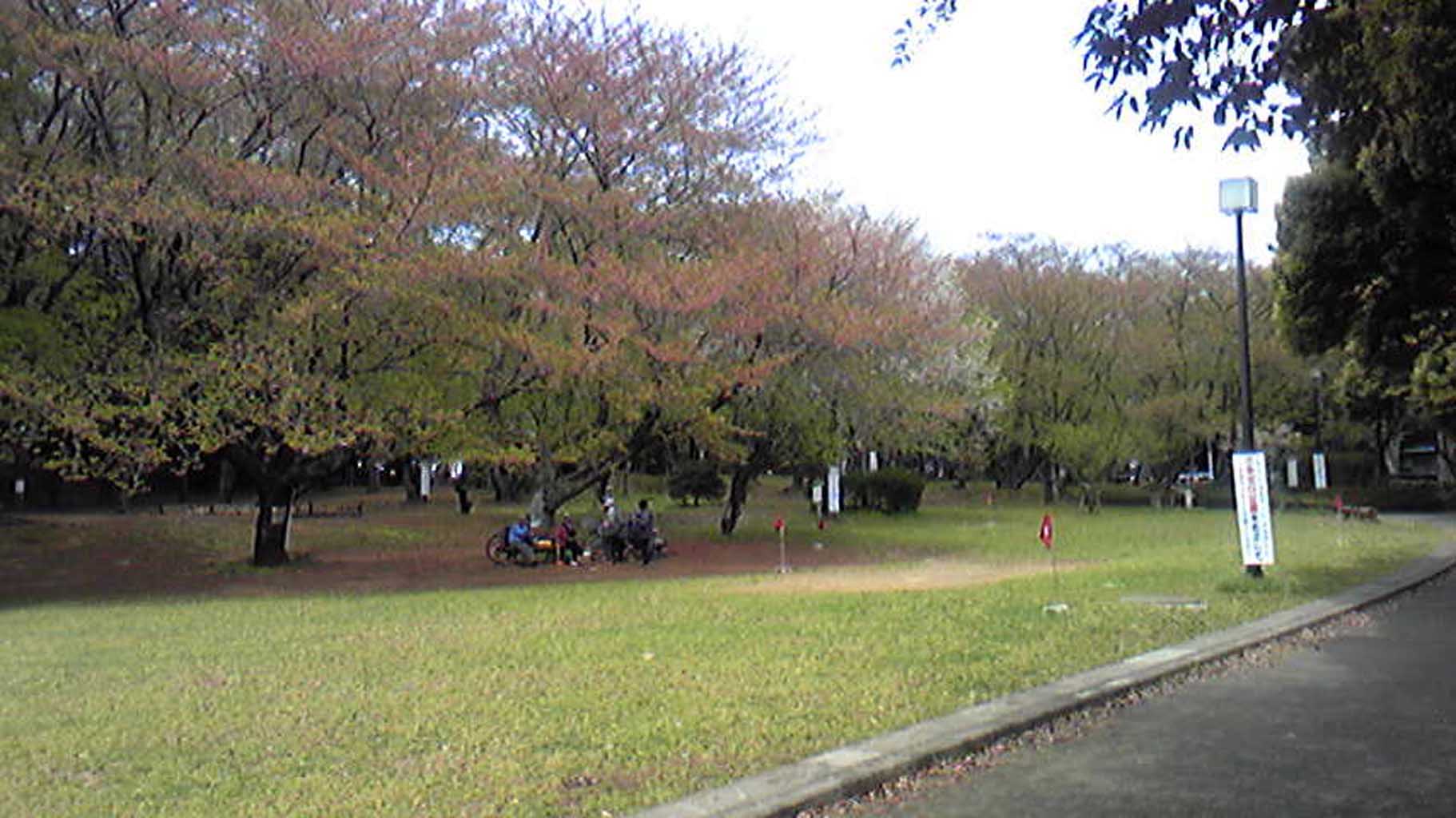 広い公園の中には、まだ花が咲いている桜の木もあります。