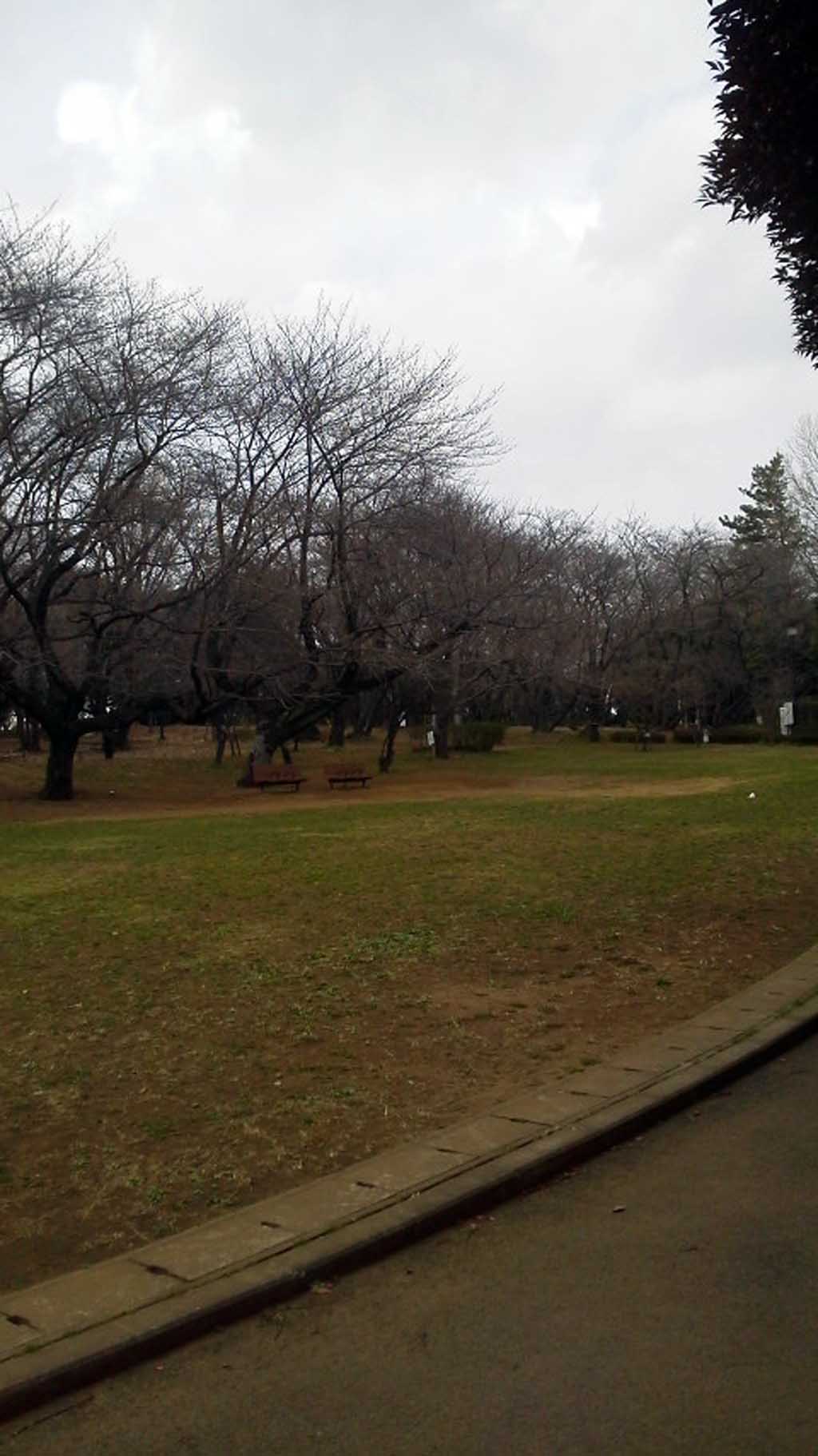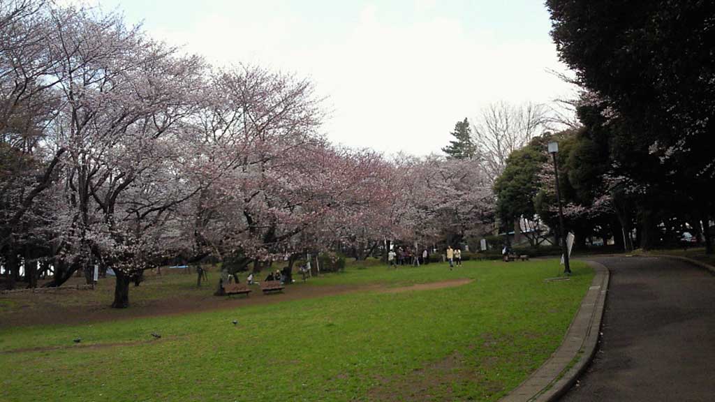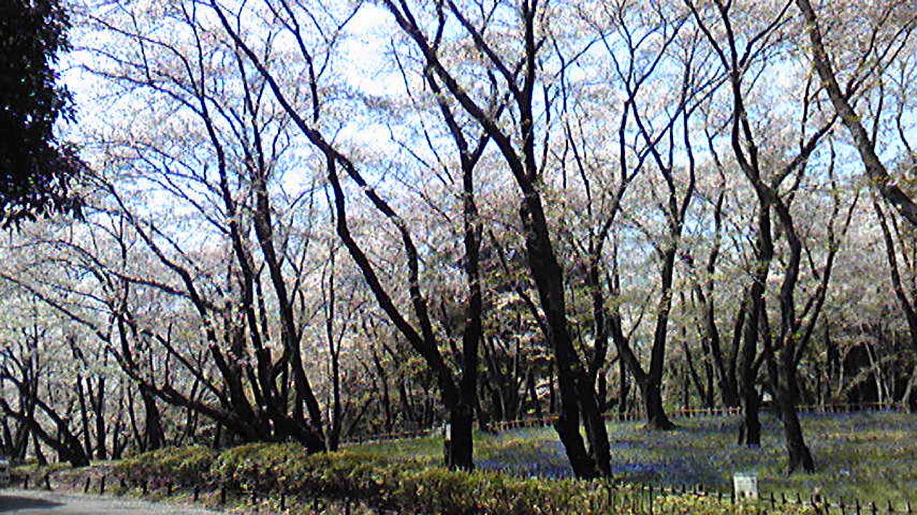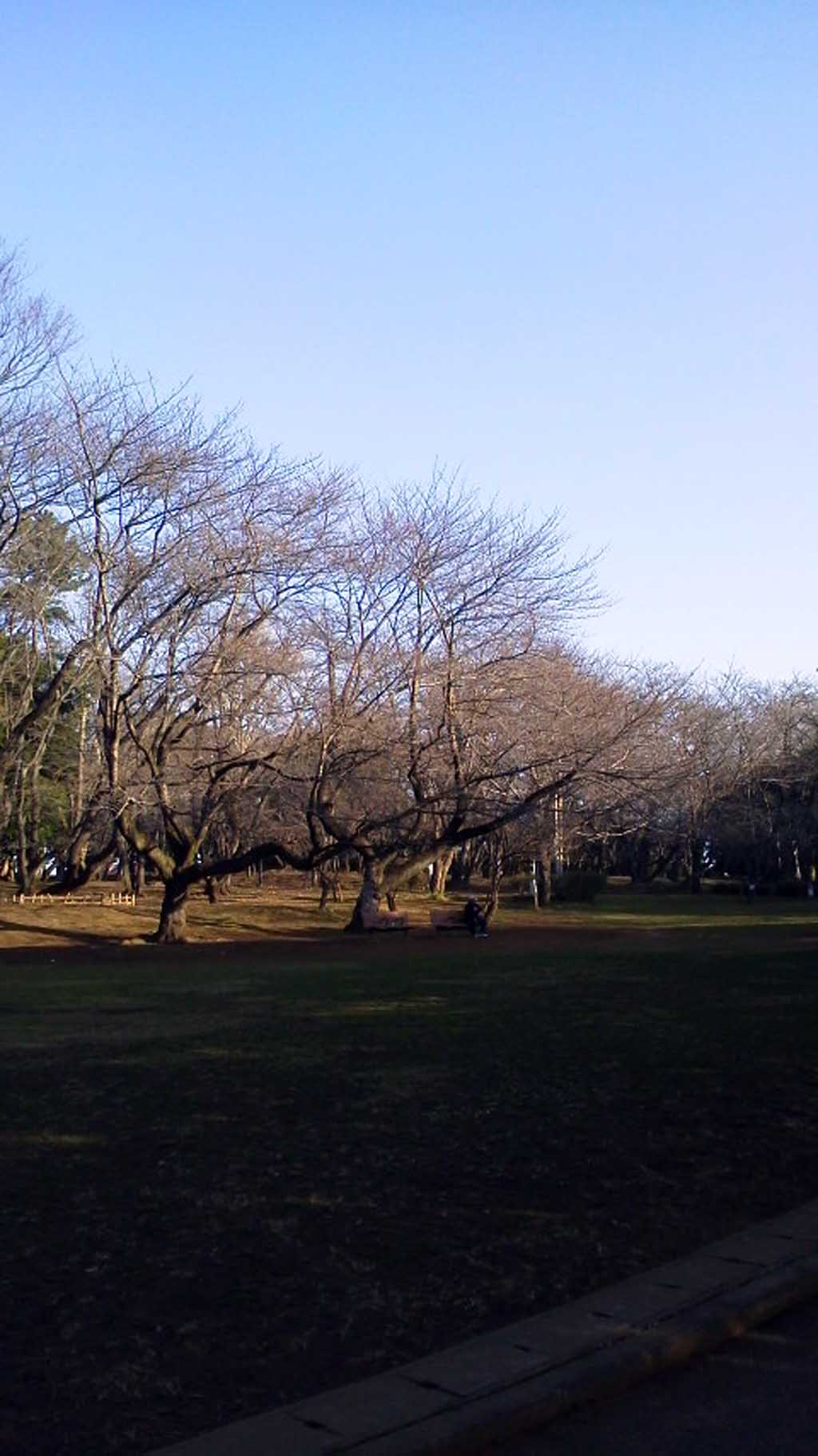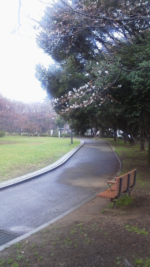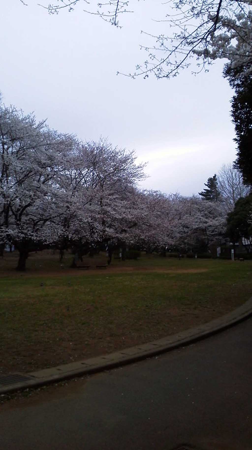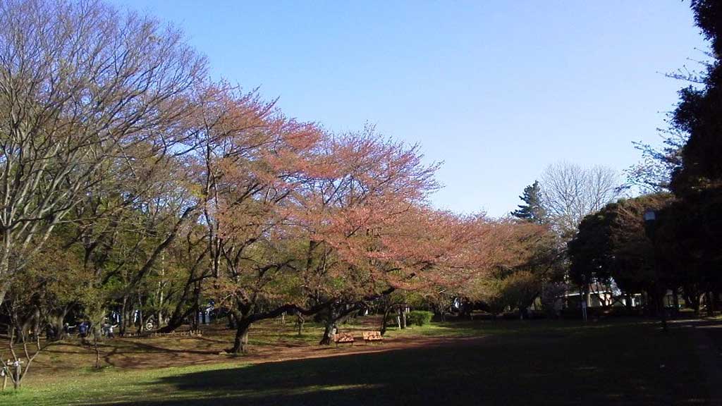 広い公園の中には、まだ花が咲いている桜の木もあります。