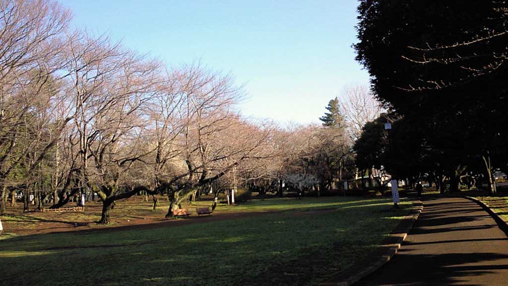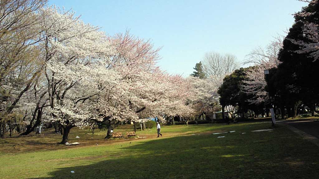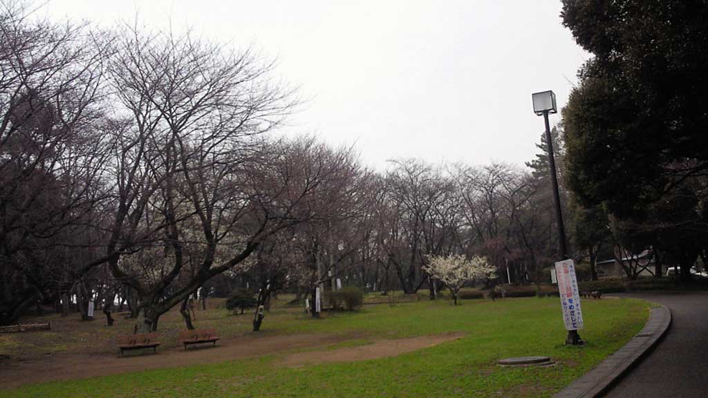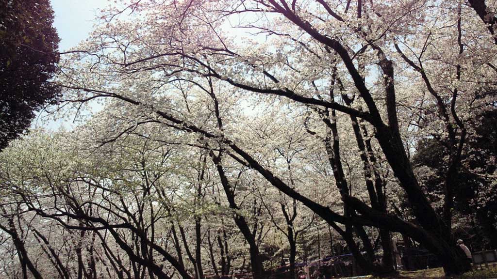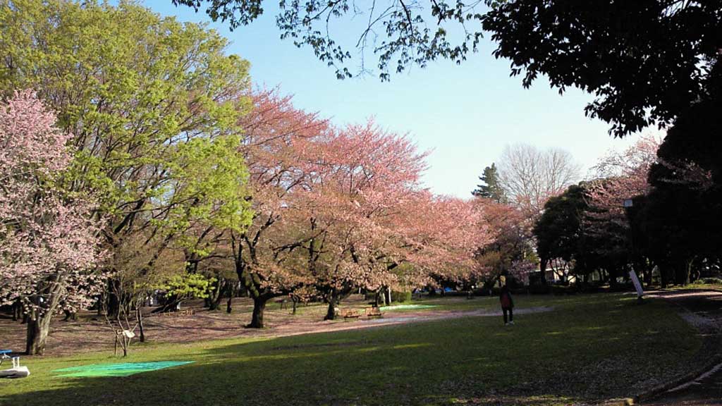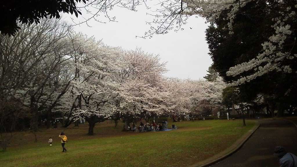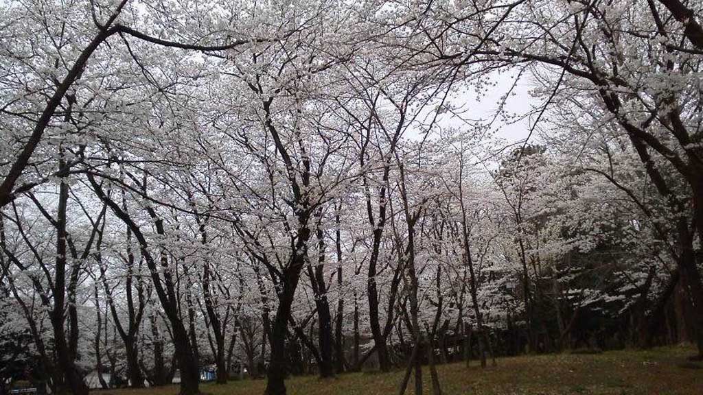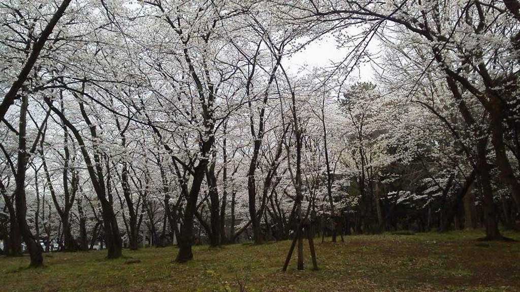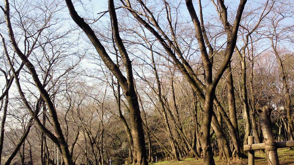広い公園の中には、まだ花が咲いている桜の木もあります。