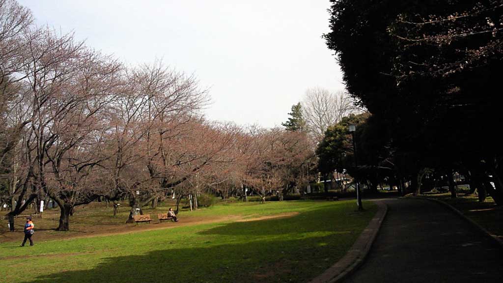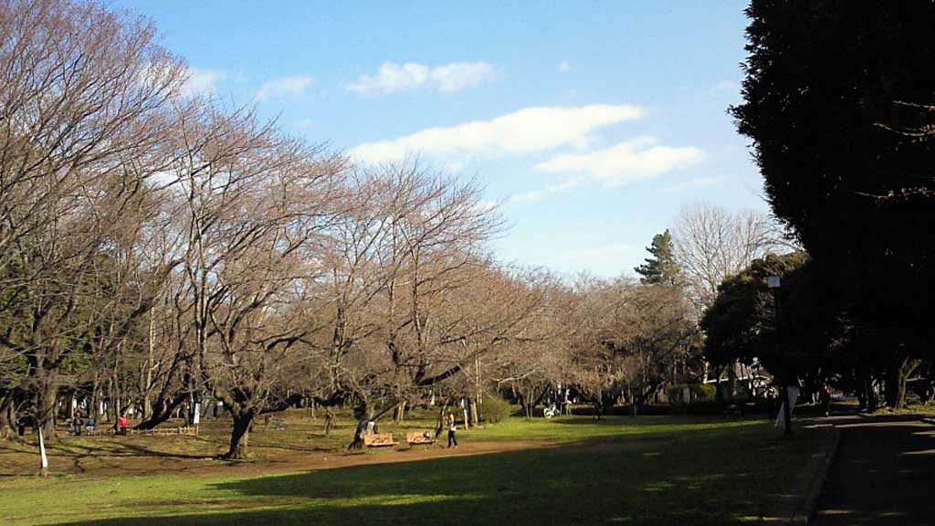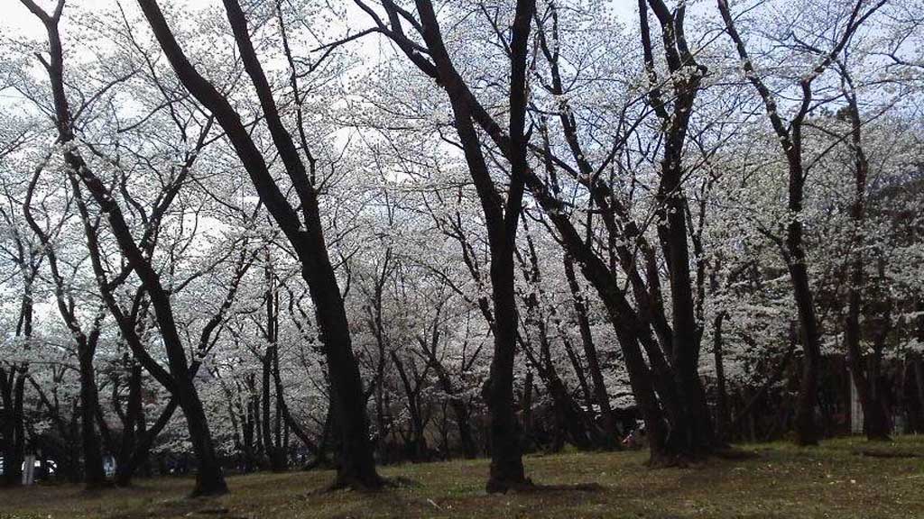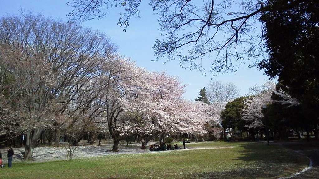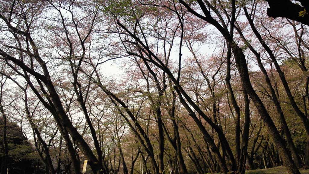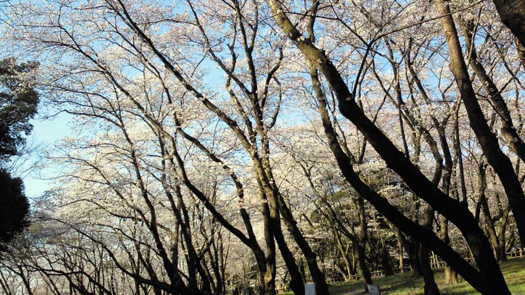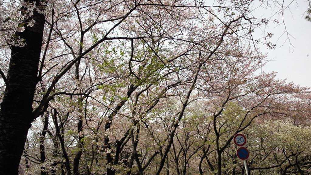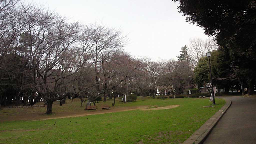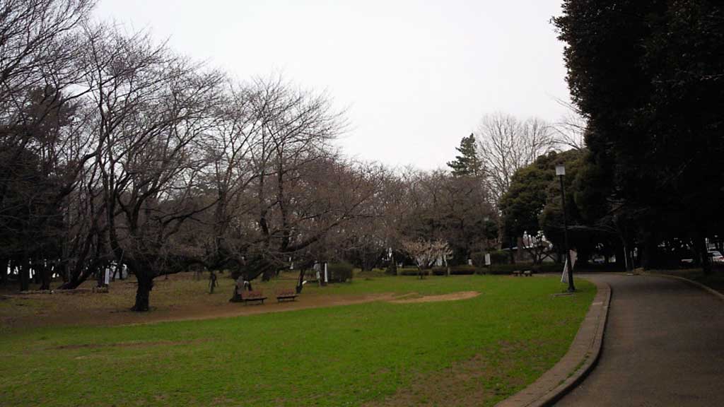 広い公園の中には、まだ花が咲いている桜の木もあります。