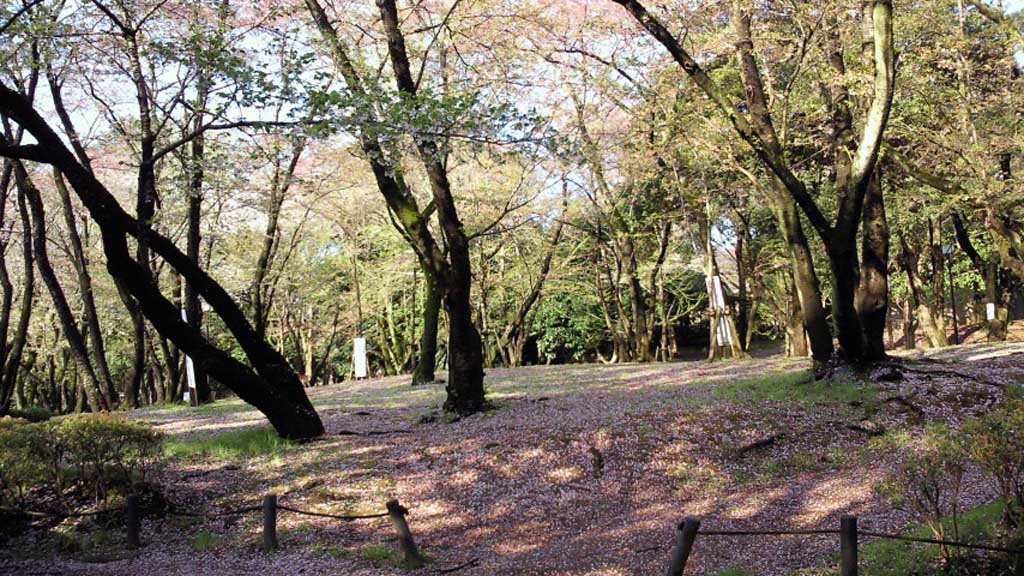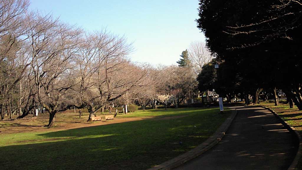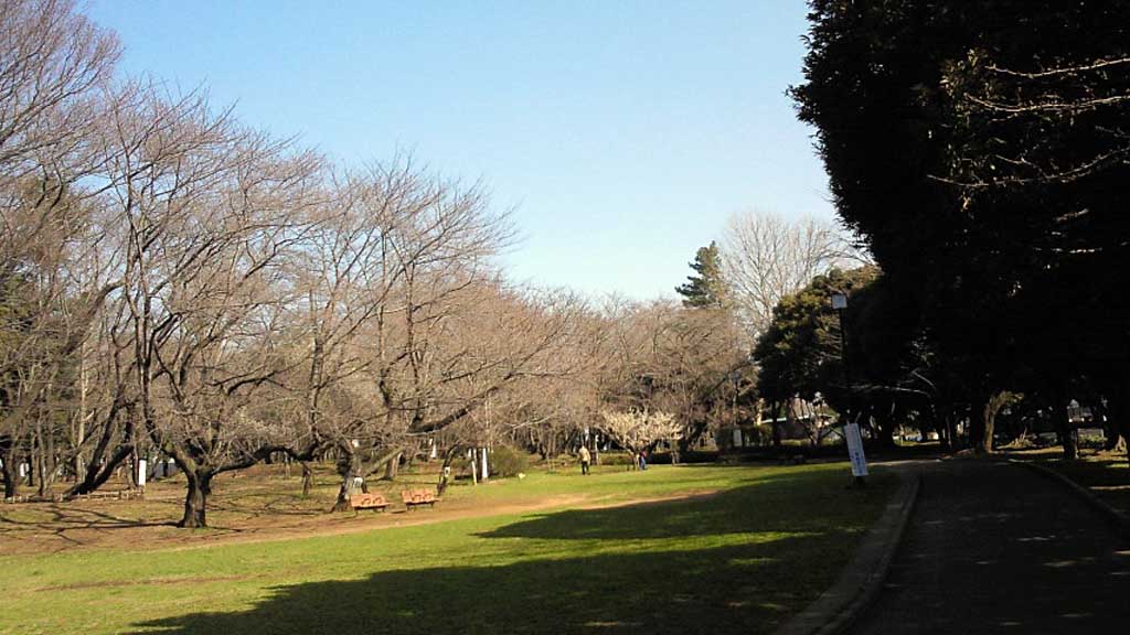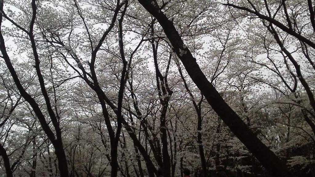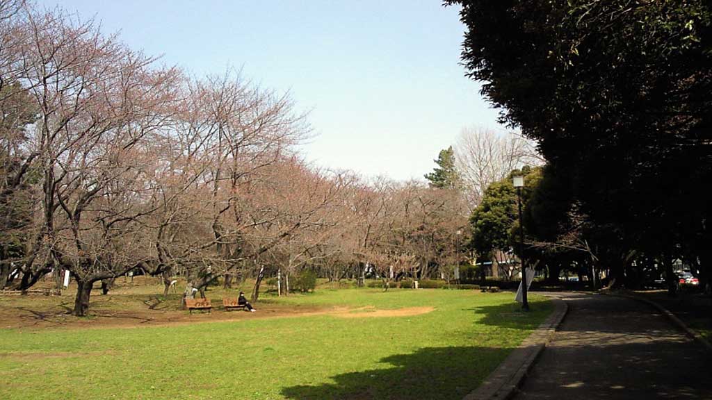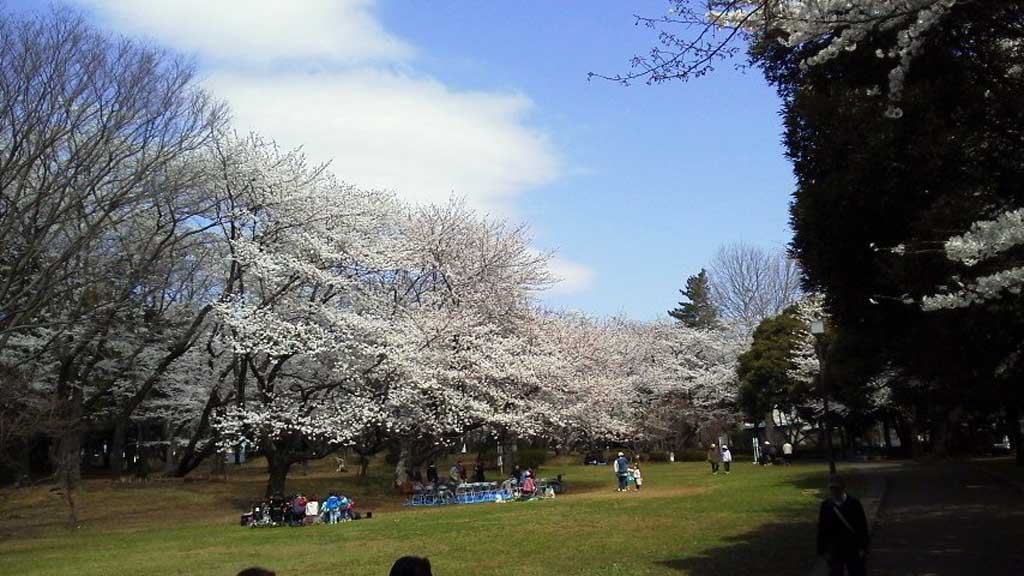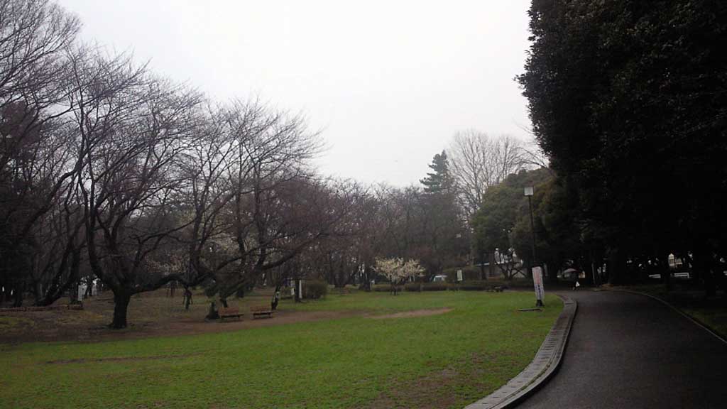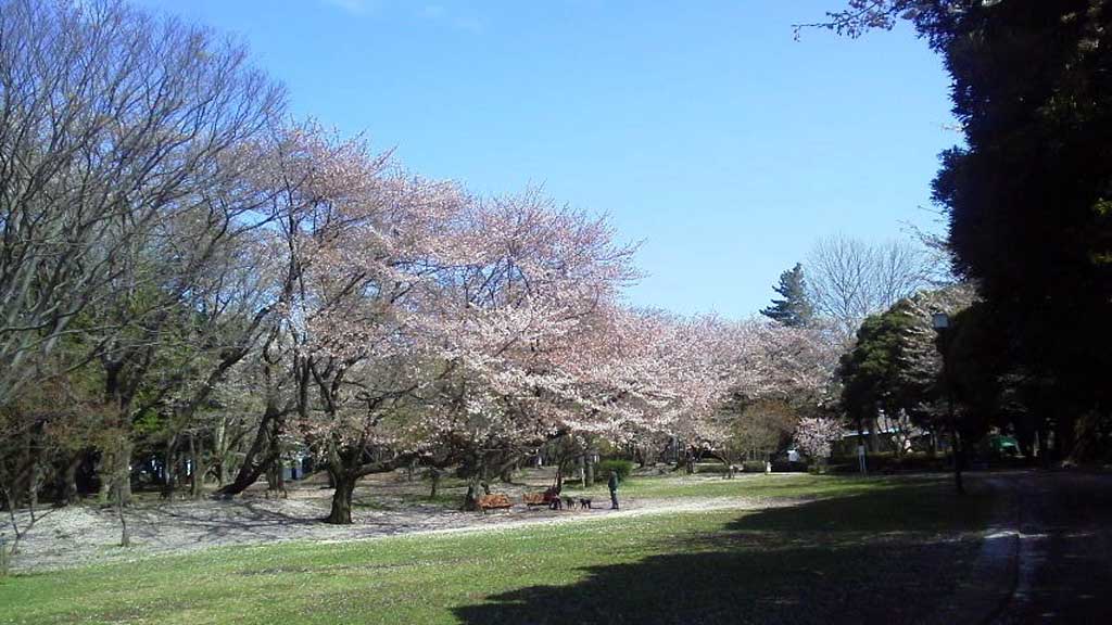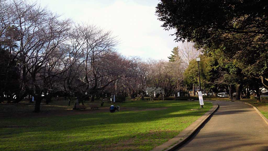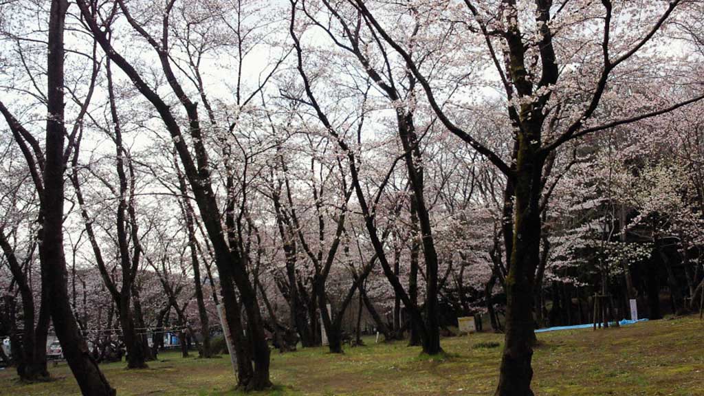 広い公園の中には、まだ花が咲いている桜の木もあります。