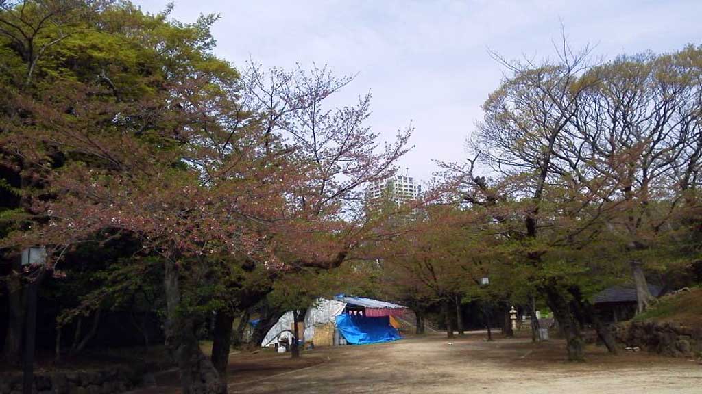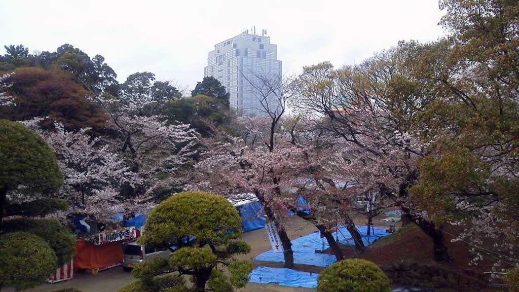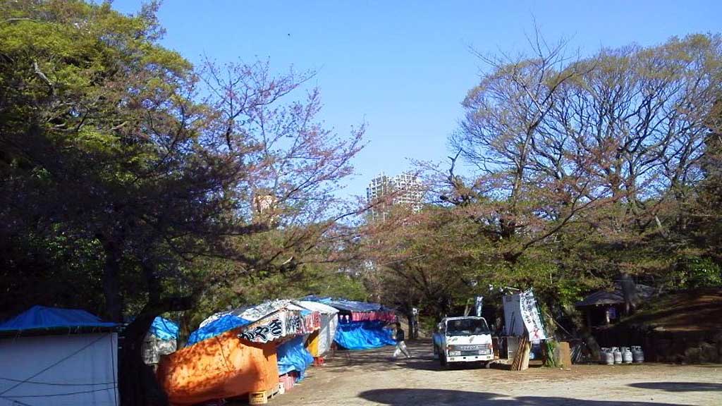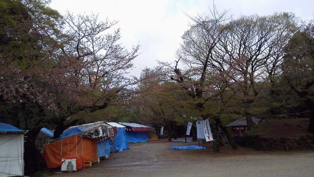 朝からお花見の準備をしている人がいます。桜はずいぶんなくなりましたが、まだお花見はできそうです
