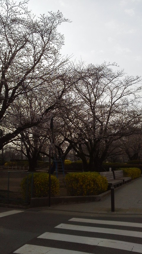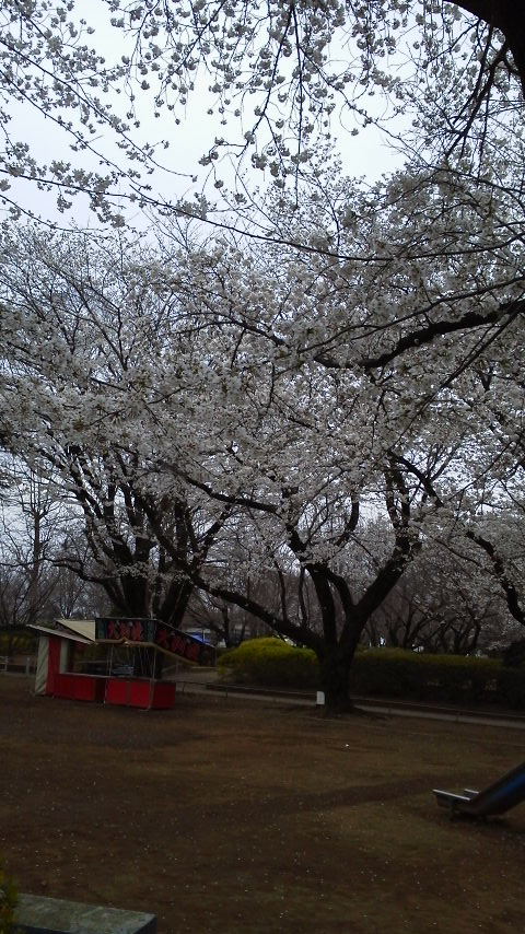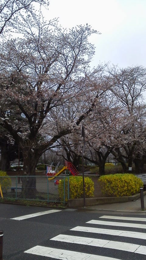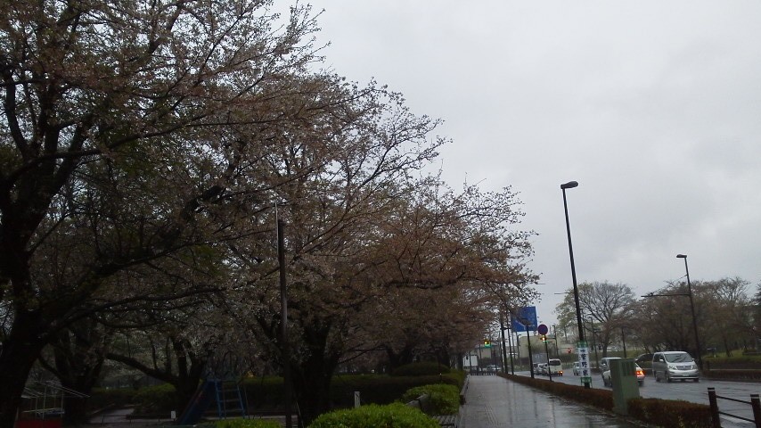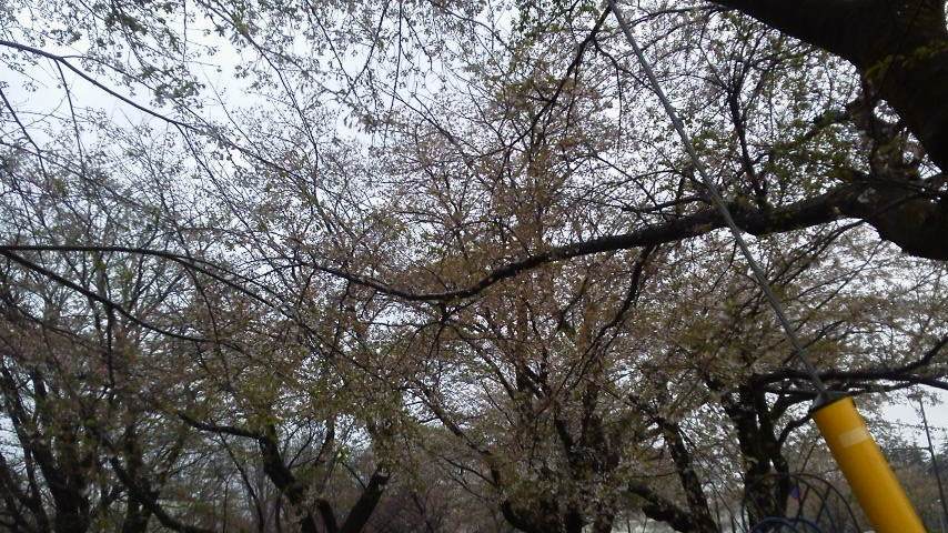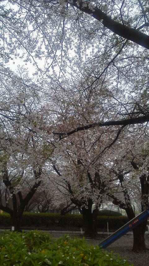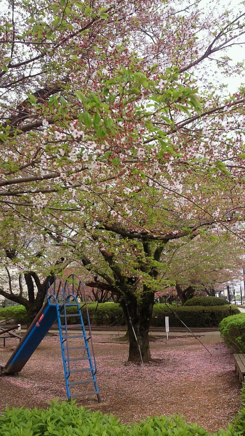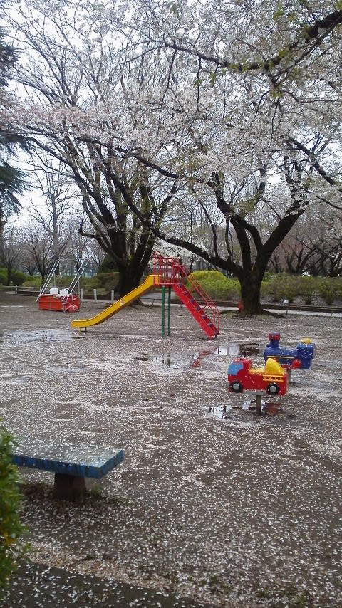 桜の花びらが公園の遊具を被っています。午後から晴れるといいですね。